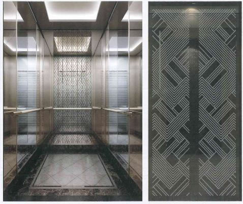 轎壁:后壁中間玫瑰金鏡面蝕刻兩側玫瑰金鏡面,側壁中間鏡面不銹鋼兩側玫瑰金鏡面夾,底部黑鈦發(fā)紋不銹鋼踢腳線